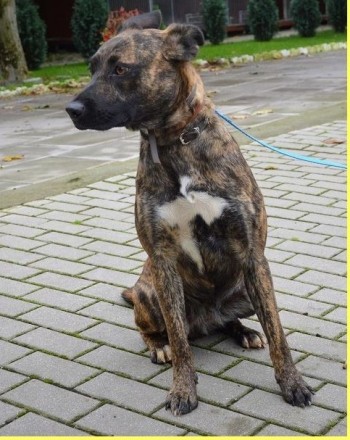 Suczka, brązowa pręgowana, wysokość poniżej kolana, wiek: 1 rok, wysterylizowana, zachipowana (chip zarejestrowany w animal ID). Jest dość nieśmiałym i płochliwym psem.