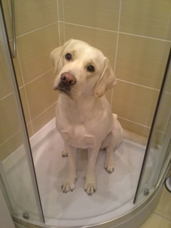 Labrador barwy biszkoptowej z jasnym cielistym noskiem pies w dniu zaginięcia miał niebieską obrożę firmy Julius K9