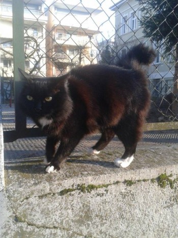 Puszysty, czarny z białymi łapkami i białym krawatem. Bardzo elegancki ogon.