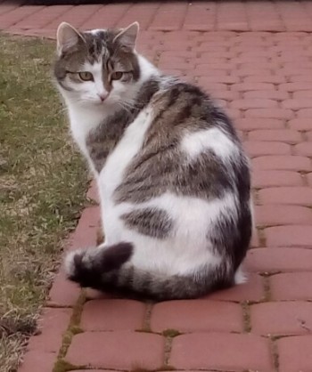 Biały w szare prążkowane łatki, ogon prążkowany szary, na tylnej prawej łapce łatka w kształcie serduszka. Kot ma 2 lata, jest oswojony, wykastrowany.