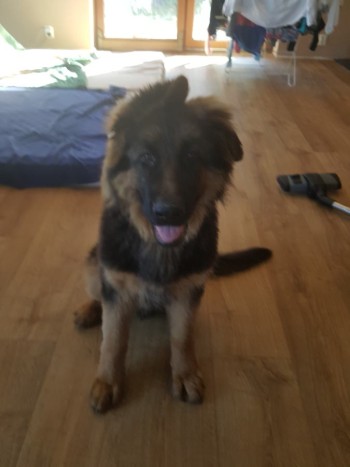 5 miesieczny Owczarek Niemiecki łagodny miał obrożę w łapki niebiesko-zieloną