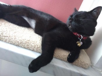 Mała czarna kotka ( 8 miesięcy ) z białą plamką na szyi. Ubrana była w czerwoną obrożę z dzwoneczkiem i sercem na którym był numer telefonu. Ma wygolony brzuszek po zabiegu chirurgicznym.