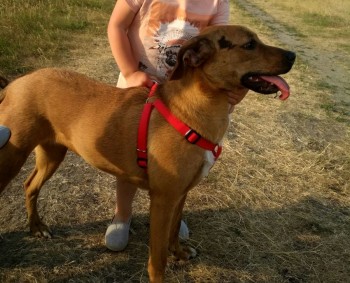 średniej wielkości (do kolana), brązowe oczy, sierść ruda