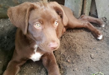 Piesek w wieku ok. 4 miesięcy, mieszaniec w typie labradora, czekoladowe umaszczenie z charakterystycznymi białymi końcówkami wszystkich łapek, biały krawat.