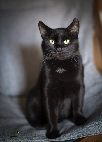 Czarny kastrat ok.5lat, kilka białych włosów na szyi. Wywinięte lewe ucho. Często wysunięty języczek. Był wiele lat kotem wolnożyjącym, może unikać człowieka. Łagodny i przyjazny. Zaginął w obcym terenie, podczas przeprowadzki (Poznań Strzeszyn Grecki).