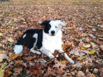 Psiak klasycznie umaszczony, czarno-biały. Wyróżnia go lewe niebieskie oko