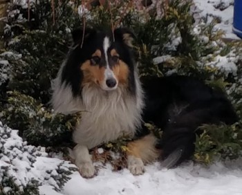 Tricolor - jak na zdjęciu Biało-czarny z elementami podpalanymi w okolicach pyska łap i pod brzuchem. Charakterystyczna biała pręga na głowie, rozszerzająca się u góry. Pies ma okolo 3,5 roku i ok. 70cm wysokości. Wabi sie Enrico (Rico) i jest łagodny.