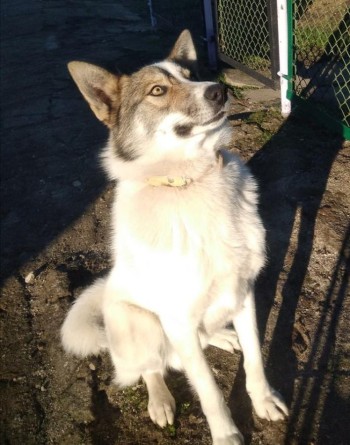 Czarna łata no ogonie oraz obroża z imieniem Alex z numerem telefonu
