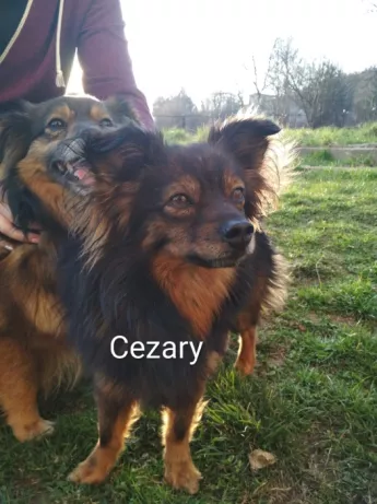 Mały długowłosy kundelek lisowatej urody, umaszczenie ciemno brązowy, ma na sobie czerwone szelki i krótką smyczkę z łańcucha, reaguje na imię Czarek