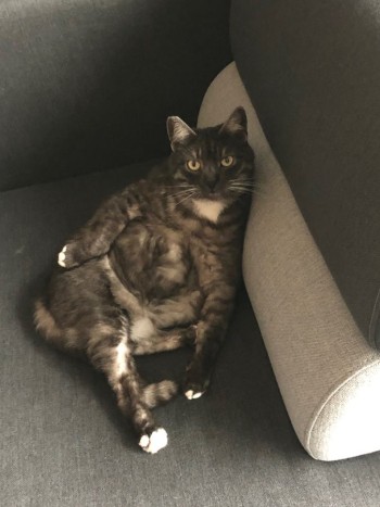 Ciemno-szare umaszczenie, białe końcówki łapek, otyły.