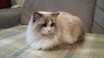Kotka Jutka o sierści długiej, szaro-białej, śliczne błękitne oczy.