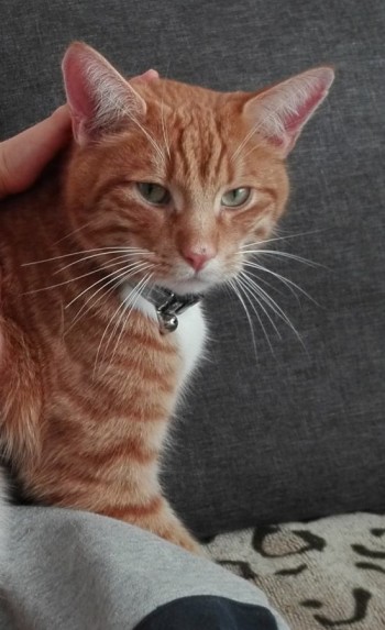 Rudy kot z białymi łapami, biała szyja i brzuchem, lewe uch troszkę rozciete przez innego kota, wysterylizowany, w dniu zaginięcia miał niebieską obroże z niebieskim dzwoneczkiem