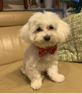 Malutki 2kg biały pies , rasy maltańczyk , młody bez obroży , krótko obcięty.