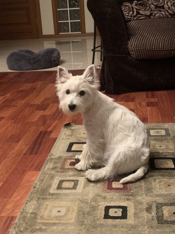 Półroczna suczka, biała, imię Ivy (czyt. Ajwi)