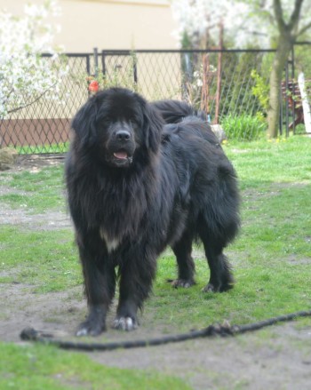 Czarny duzy pies ,bardzo łagodny, biały krawat, ma białe paluszki na trzech łapach. Jest po operacji prawego stawu biodrowego