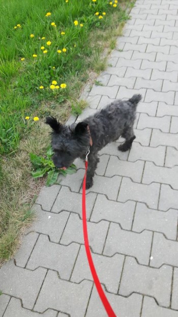 Mój pies nazywa się Yogi malutki ciemno siwa sierść obroża czerwona z wisiorkiem czipa nie jest groźny ogonek krótki proszę o kontakt jeśli widzisz mojego pupila