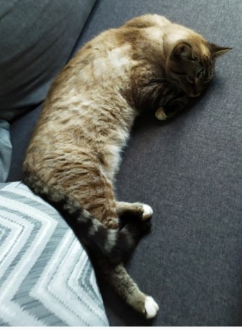 5-letni, kastrowany kocur, reaguje na imię Alvin. Na stałe przyjmuje leki nasercowe, cecha charakterystyczna: odstający do góry pazur u przedniej łapy (krzywo zrośnięte złamanie palca)