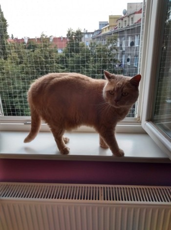 Kot brytyjski, rudy, z ciemniejszymi pręgami na łapach i złotymi oczami, duży, ośmioletni, nieśmiały kanapowiec, niewychodzący i niezaczipowany. Reaguje na imię Gordon.