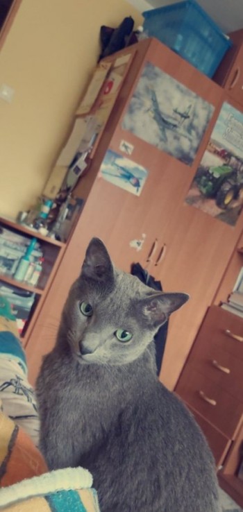 Kotek 8 letni , rasy rosyjski niebieski, smukłej budowy, szara sierść, zielone oczy, lawendowe poduszki łap. Przyjaźnie i ufnie nastawiony do ludzi, bardzo związany z właścicielem.
