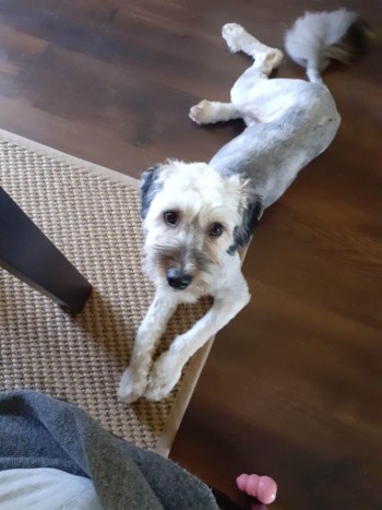 średniej wielkości, jasno szary, krótko ostrzyżony z kitą na ogonie, płochliwy, reaguje na Karmel, Karmelek