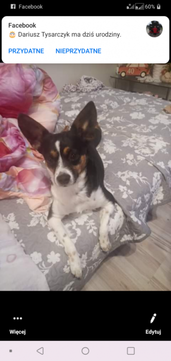 Piesek czarno biały różowa obroża z imieniem i numerem telefonu. Mały