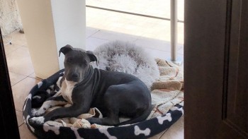 Wysoka, chuda suczka, białe umaszczenie pod pyszczkiem, umaszczenie szare