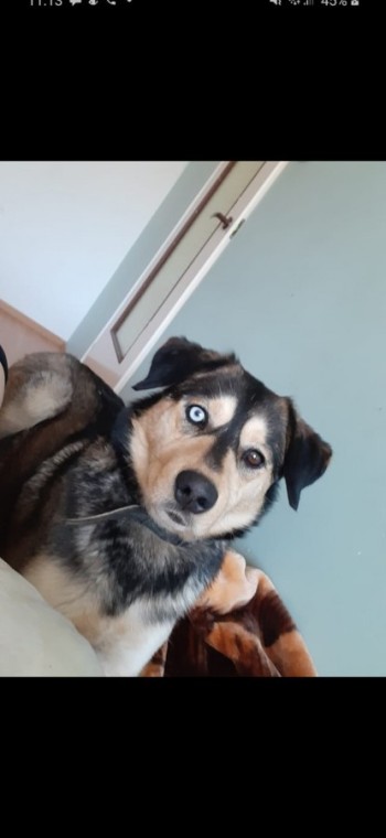 Mieszaniec: husky z wyżłem ,kłapnięte uszy ,lewe oko niebieskie, drugie brązowe ,sierść czarna podpalana ,kufa jak husky , ma czerwona obrożę. Ma chipa.