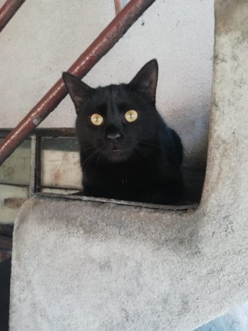 Czarny. Około roczny kocur, wykastrowany, udomowiony, płochliwy, raczej nie da się złapać .