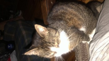 Kotka pręgowana z białymi elementami (brzuszek, końcówki łapek, przód pyszczka), różowy nosek.