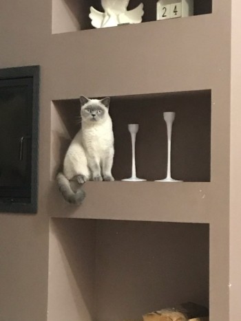 Duży, biało-czarnym, ciemny pyszczek, uszy, łapki i ogon. (point)