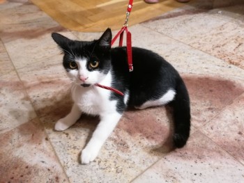 Wąsk - pieszczoch, łapki białe, pod bródką czarna łatka, brzuszek biały, Kotek ma ok 6-7 miesięcy. Przewidziana nagroda za znalezienie.