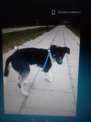 pies do kolana, powinien mieć czerwona obroże i smycz w kolorze czerwonym Ma ok 10 miesięcy wazy około 11 kg. Pies jest przygarnięty wiec może bać się ludzi i ucieka od nich Nie jest w żadnym stopniu agresywny.