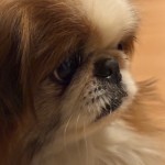 Biały z biszkoptowymi uszami,tyłozgryz.Wielkosci maltańczyka.