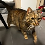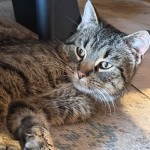 Znaleziony w godzinach wieczornych w Popielawach. Średniej wielkości, pręgowany. Bardzo przyjazny i towarzyski.