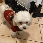 Biały malutki piesek, ma czerwony sweterek i zielone szelki