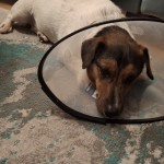 Średniej wielkości, mieszaniec, ułożony, raczej domowy, na szyi obroża I kolczatka.
