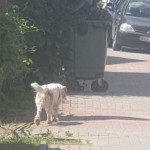 bialo rudy szlaja się po ulicy Stoczek m bialo niebieska obroze.