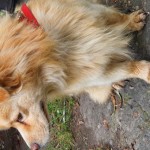 Rudy seter z obroża i adresówka fundacji. Czip niezarejestrowany