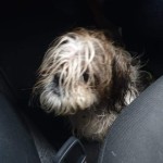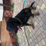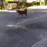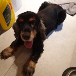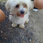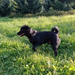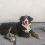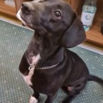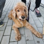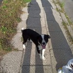 piesek do połowy kolana, przyjazny, zadbany, reguje na komendy. wiek ok 2 lata. biale łapki i krawat.