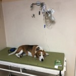 5letni beagle Scooby tricolor biało,brązowy, czarny z biała latka na tyłku nad ogonem z czerwona obraza i imiennikiem z danymi właściciela.