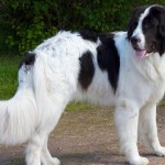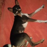 Szczupły, na wysokich nogach, czarno-biało-rudy, sterczące uszy.