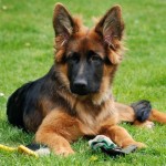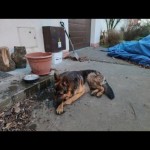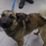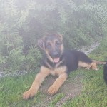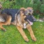 Młody samiec owczarka niemieckiego, przyjazny, trochę wystraszony. Reaguje na proste komendy siad, leżeć.