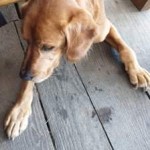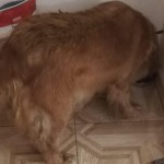 pies jest rudawy. Sięga ponad kolano. Oklapnięte uszy. Ma parcianą, pomarańczową obrożę, krótka sierść