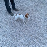 Piesek ma przywieszke przy obroży z adresem przychodni dla zwierząt 97-500 Radomsko, ul. Wilsona 21 nr tel. 44 682 45 44