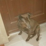 Brązowy piesek, rasy mieszaniec, z kulawą łapka