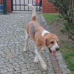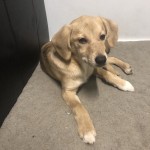 Nieduża, młoda, biszkoptowa suczka. Kuleje lekko na tylną łapkę.