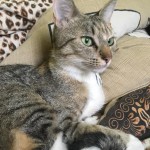 Znaleziona kotka. Szara z czarną obróżką z diamencikami i ciemną przeciwpchelną. Wygląda na kota ok.rocznego zadbanego, przyjazna, nie boi się ludzi.