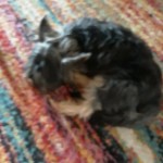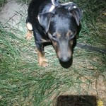 Pies mały, czarny z brązowymi łapkami, krótki ogon jakby przycięty
