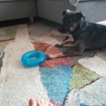 duża czarna sunia, podobna do labradora, większa i smukła. szybka i zwinna, przymilna lgnie do człowieka.