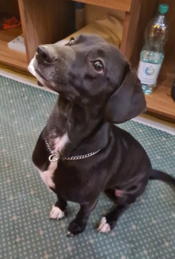 piesek do połowy kolana, przyjazny, zadbany, reguje na komendy. wiek ok 2 lata. biale łapki i krawat.